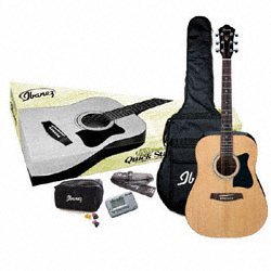 The Ibanez Quickstart pack is a great and easy way to get your feet wet in the world of acoustic guitar playing. Includes a V50 acoustic guitar, strap, gigbag, tuner and accessory pouch. Receive a free instructional DVD when you register your pack online.